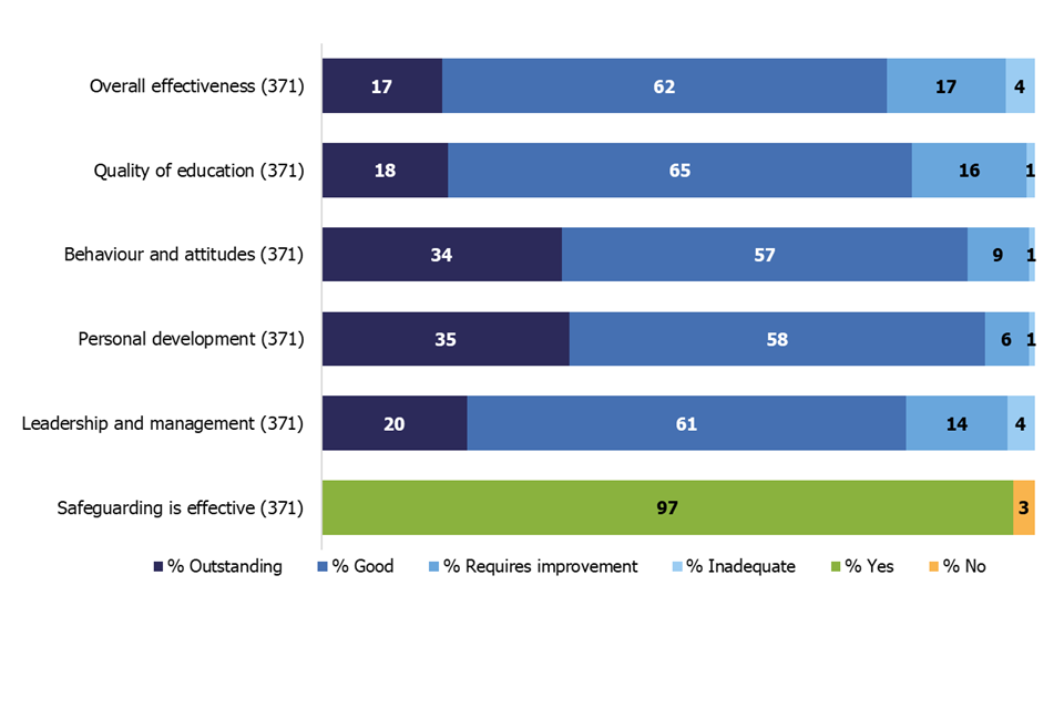 | Outcome | Number of schools | % Outstanding | % Good | % Requires improvement | % Inadequate |