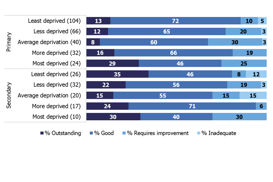 Twenty-one per cent of the previously exempt primary schools that had a graded inspection in 2021/22 were judged to require improvement or to be inadequate. Ten per cent of all open primary schools received a grade of requires improvement or inadequate at their most recent inspection.[footnote 7]