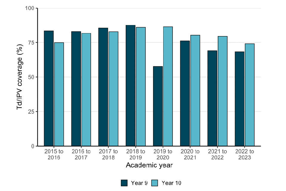 Td/IPV vaccine coverage for year 9 in 2022 to 2023 was 68.3%. This is slightly lower than coverage in 2021 to 2022 and not yet back to pre-pandemic levels. Coverage in the year 10 cohort was 74.1%, which is no improvement on uptake recorded for this cohort in year 9 during the previous academic year. When coverage was calculated for each NHS commissioning region, the estimates varied considerably.