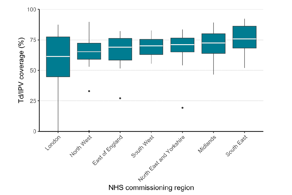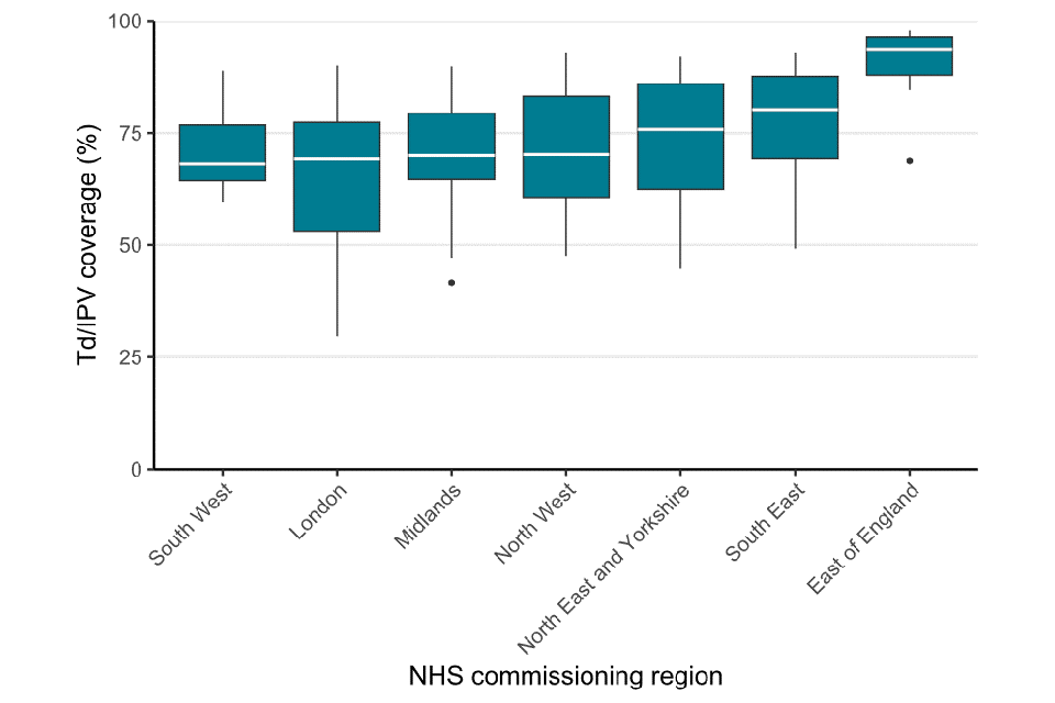 - Td/IPV coverage in year 9 students was highest in the South East (74.9%) and lowest in London (60.4%)