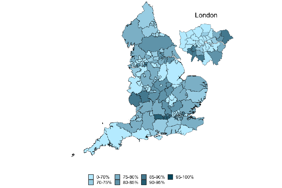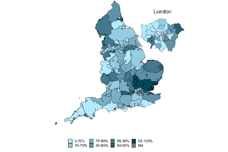 - local authority level coverage ranged from 97.8% (Central Bedfordshire) to 41.6% (Leicester)