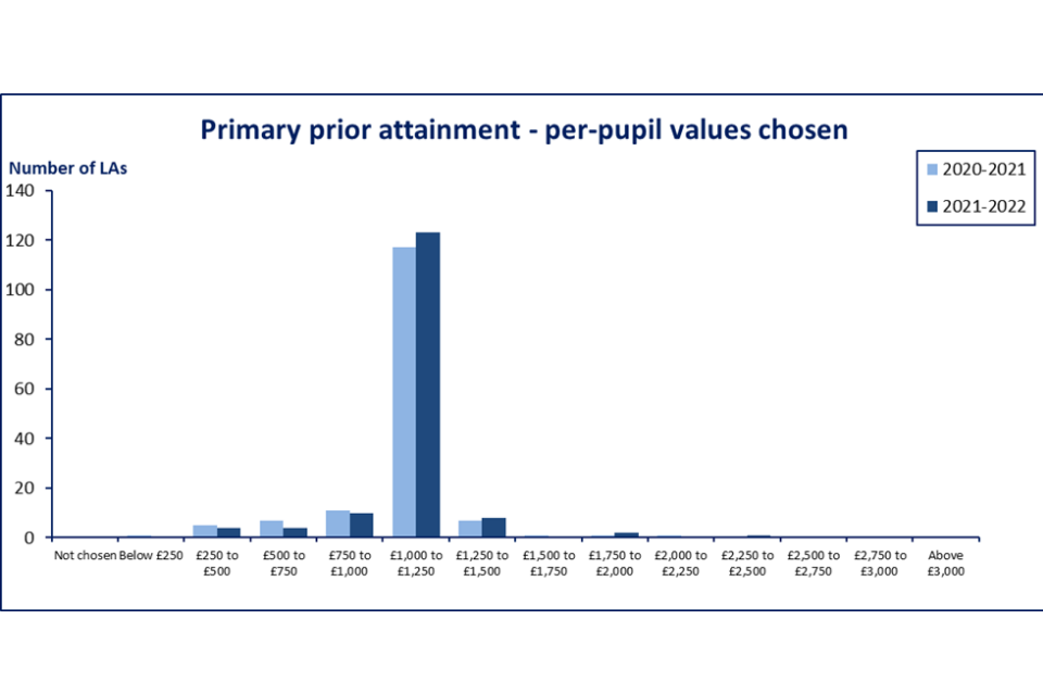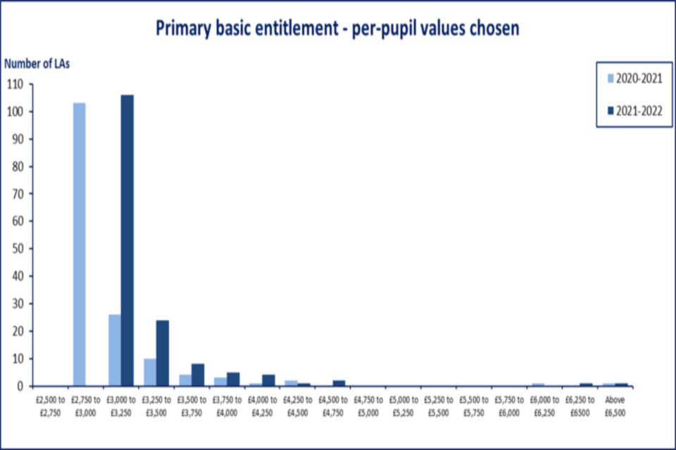 The NFF primary per pupil value increased from £2,857 in 2020 to 2021 to £3,123 in 2021 to 2022 (including funding for the teachers’ pay and pensions grant, which were brought into the NFF in 2021 to 2022). Many LAs that were following the NFF values in 2020 to 2021 have therefore followed this approach in their local formulae in 2021 to 2022, bringing their primary per-pupil value above £3000.