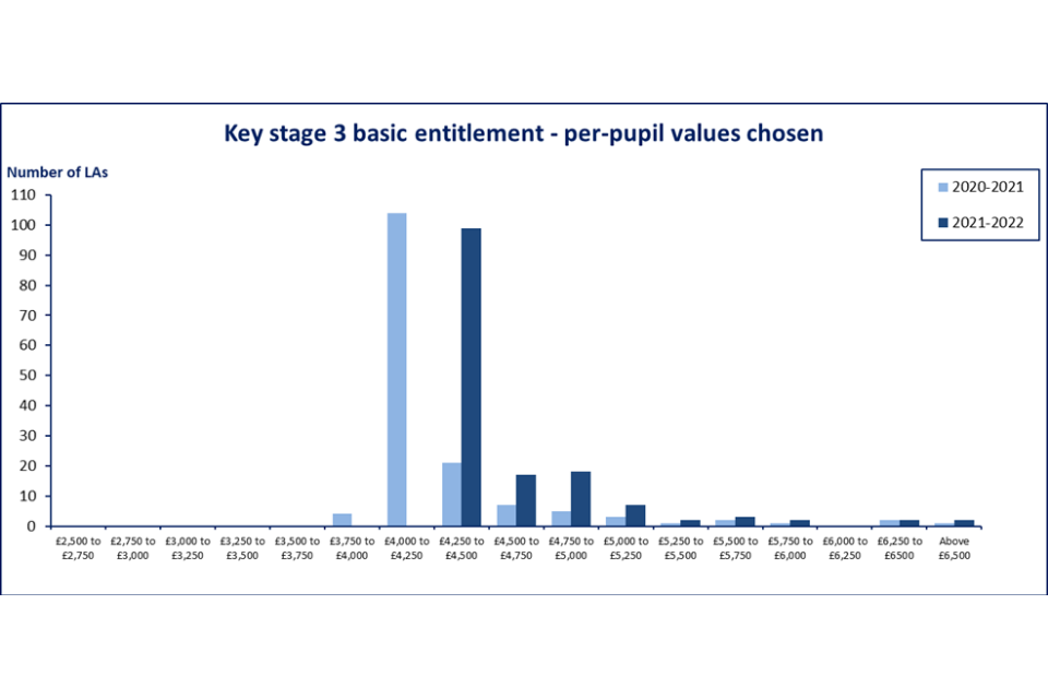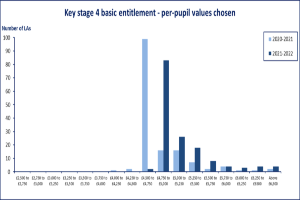 The NFF KS3 per pupil value increased from £4,018 in 2020 to 2021 to £4,404 in 2021 to 2022 and for KS4 they increased from £4,561 to £4,963 (including funding for the teachers’ pay and pensions grant, which were brought into the NFF in 2021 to 2022). Many LAs that were following the NFF values in 2020 to 2021 have therefore followed this approach in their local formulae in 2021 to 2022, bringing their primary per-pupil value above £4,250 for KS3 and £4,750 for KS4.