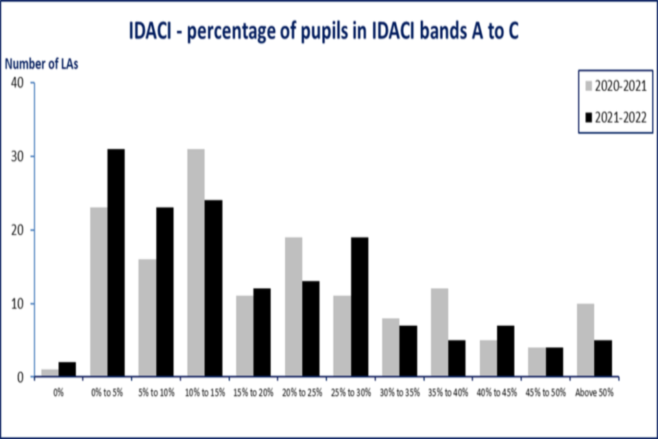 For 2021 to 2022 we have used 2019 data from the IDACI in place of 2015 data. We have changed the basis on which we assign pupils to the IDACI bands: they are now assigned based on rank rather than score. For example, Band A now consists of pupils in the most deprived 2.5% of lower super output areas (LSOAs), instead of consisting of pupils in LSOAs with an IDACI score greater than 0.5. The size of each of the bands created for 2021 to 2022 was set to maintain a similar proportion of pupils nationally in each band as there were in 2020 to 2021.