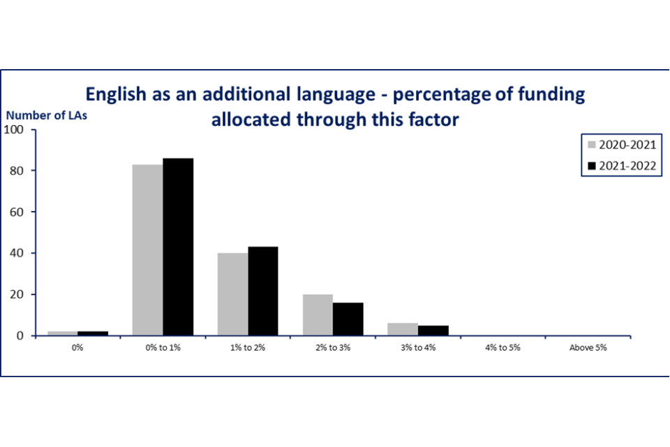 In 2021 to 2022 EAL was used by all but 2 local authorities, the same as in 2020 to 2021. Local authorities can choose one of 3 indicators for this factor: the number of pupils with EAL who entered the compulsory school system in either the last 1, 2 or 3 years. The NFF allocates funding to EAL pupils entering the compulsory school system in the last 3 years. Of the 150 local authorities including the factor, 143 have used the same criteria as the NFF: an increase from 139 in 2020 to 2021.