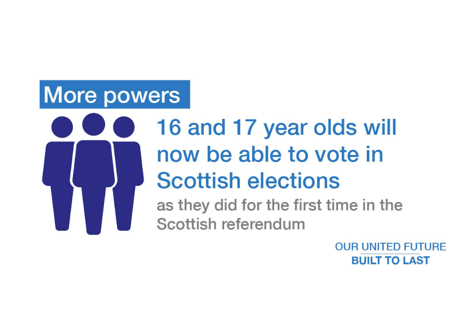 UK legislation will state in law that the Scottish Parliament and Government are permanent and given wide-ranging new powers over how they are elected and run. The Scottish Parliament will be given the power to legislate to reduce the voting age to 16 for Scottish Parliament and Scottish local government elections.