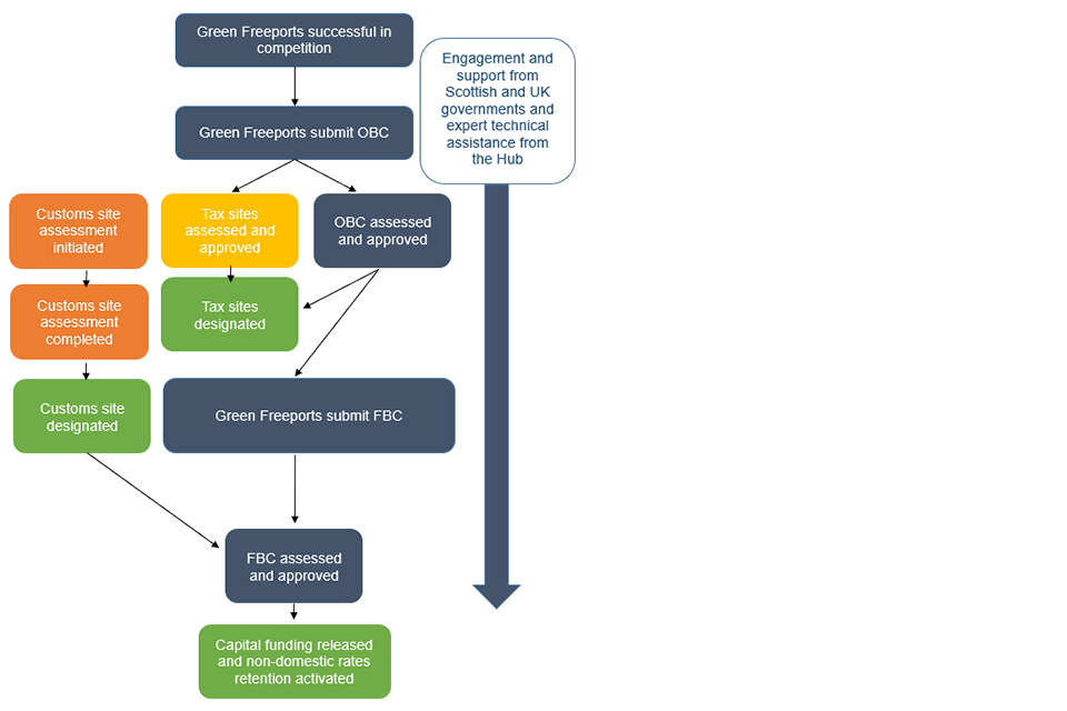 1.1.3 The 3 processes are linked and aligned: through the Business Case Process, the strategic vision, economic impact, and delivery structures for the tax and customs sites will be scrutinised. Conversely, the Tax and Customs Processes will enable the activation of key policy levers and hence the delivery of the Green Freeport vision as articulated in the Business Case. Consequently, a Green Freeport’s tax sites will not be designated until its OBC has been approved and at least one customs site will need to have been designated before the FBC can be approved.