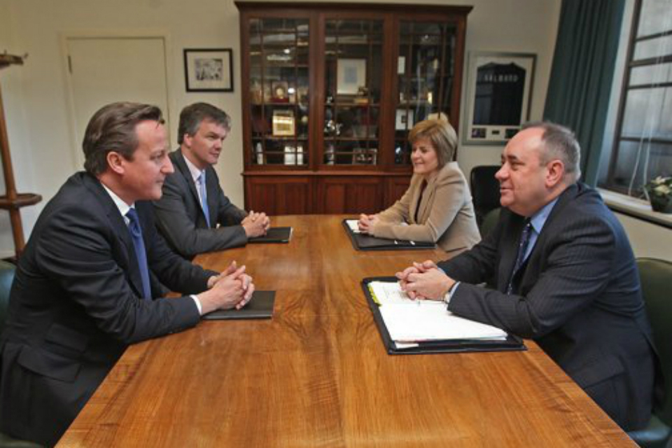 Prime Minister David Cameron and First Minister Alex Salmond sign the Edinburgh Agreement.