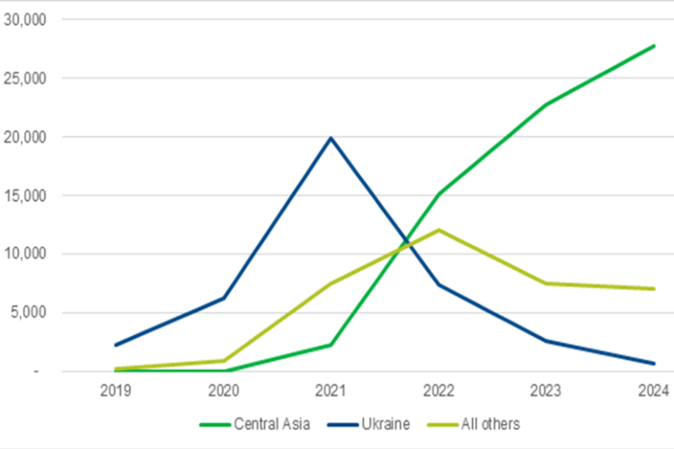Figure 1: Number of seasonal workers on the visa route from Ukraine, Central Asia versus all other countries, 2019 to 2024