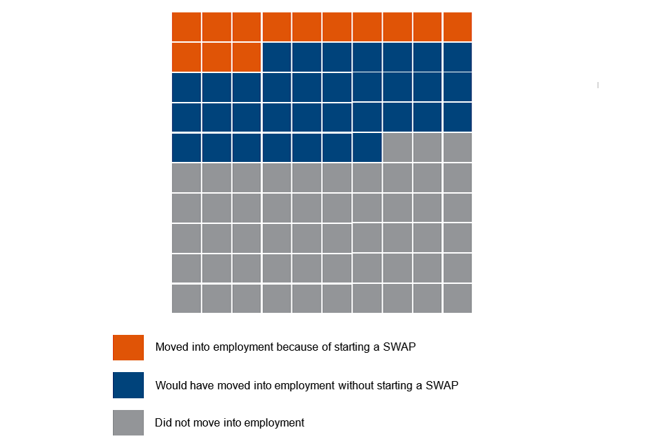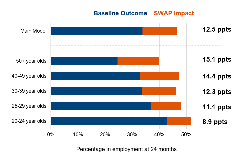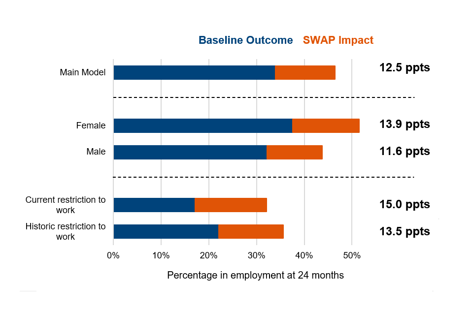 - Starting a SWAP has a positive impact on all subgroups examined in this report. Crucially, starting a SWAP tended to have a higher impact for the more disadvantaged groups who have lower baseline employment outcomes
