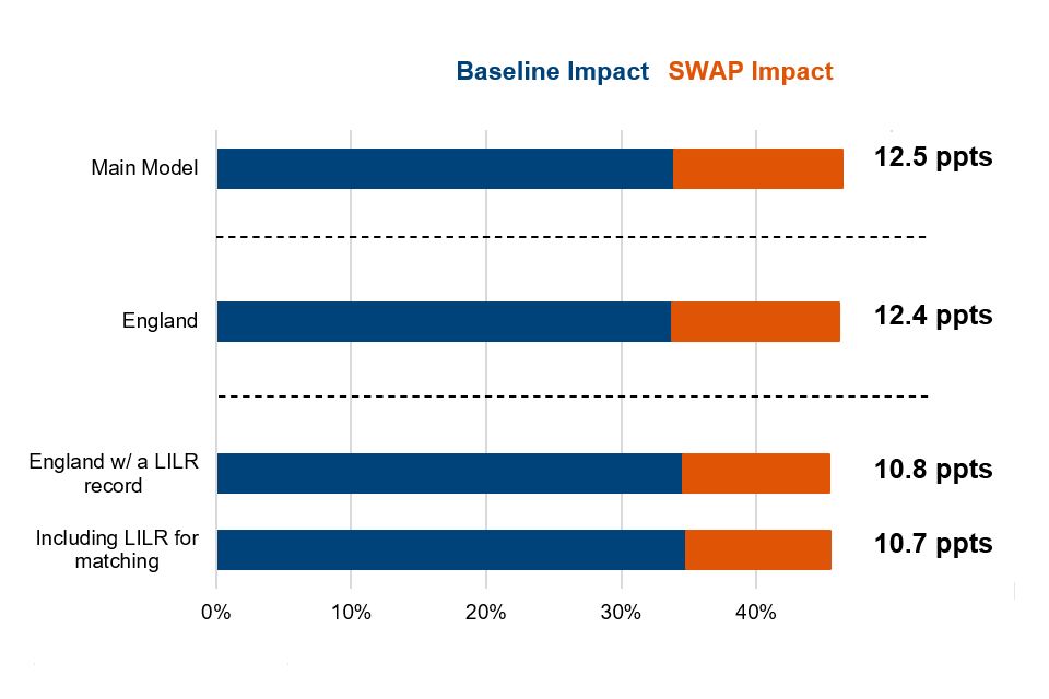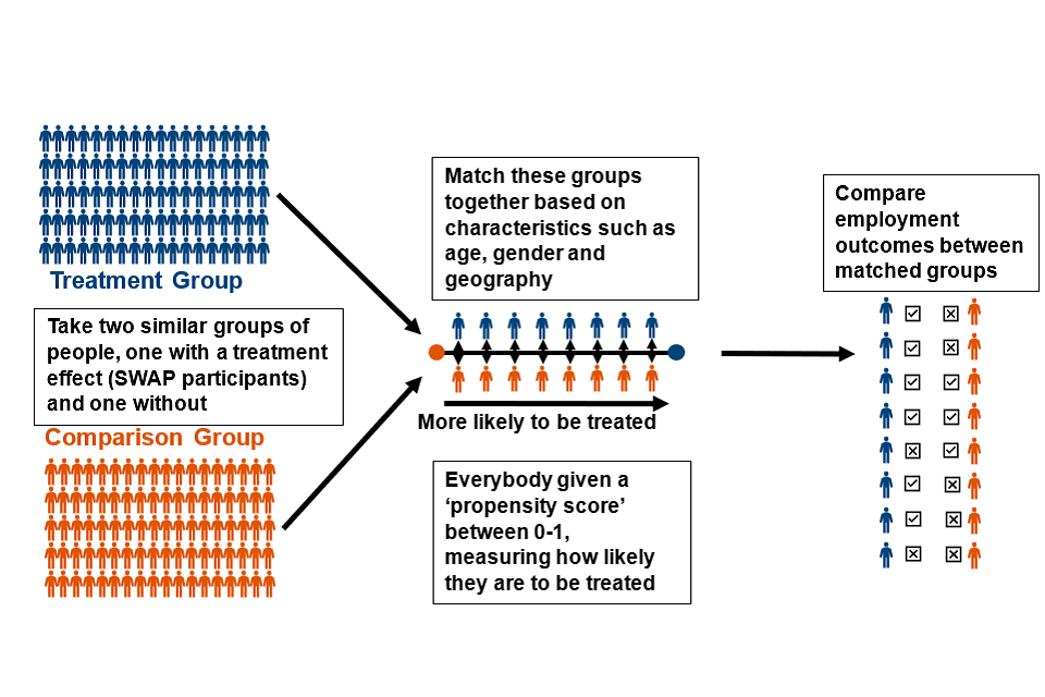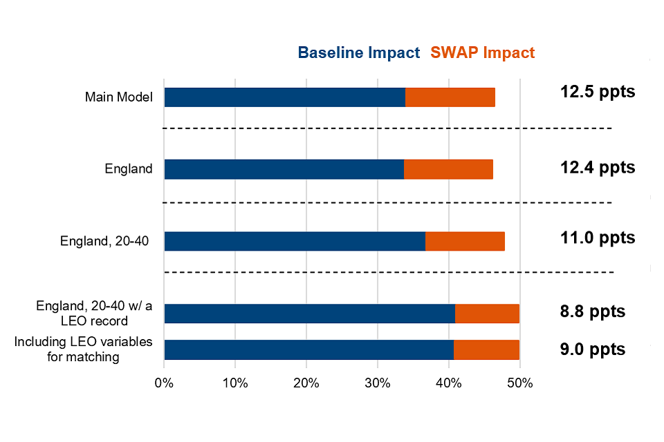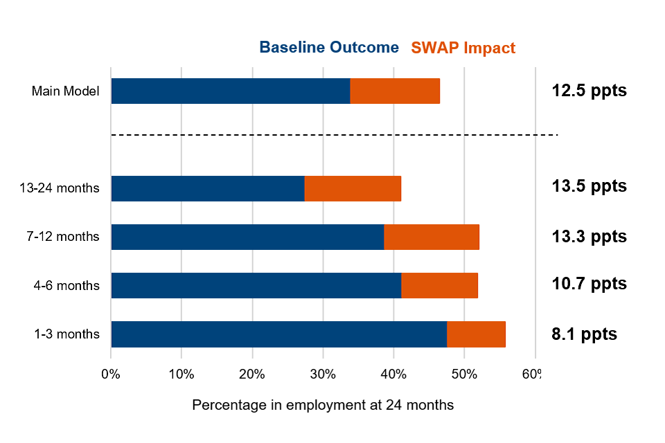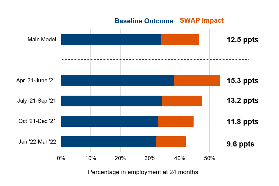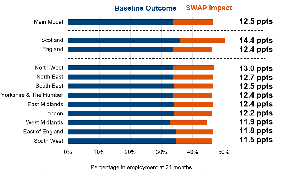 The impact assessment looks at movement into employment for individuals who started a SWAP from April 2021 to March 2022. Earnings are tracked up to 2 years after starting a SWAP to measure whether somebody was in work at that point. Outcomes from this group are compared to individuals who were eligible to start a SWAP but did not start a placement. This average treatment effect approach allows us to measure the labour market impact of starting a SWAP directly.