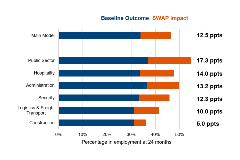 | SWAP sector | Baseline Outcome: % in employment at 24 months | SWAP Impact: % in employment at 24 months |