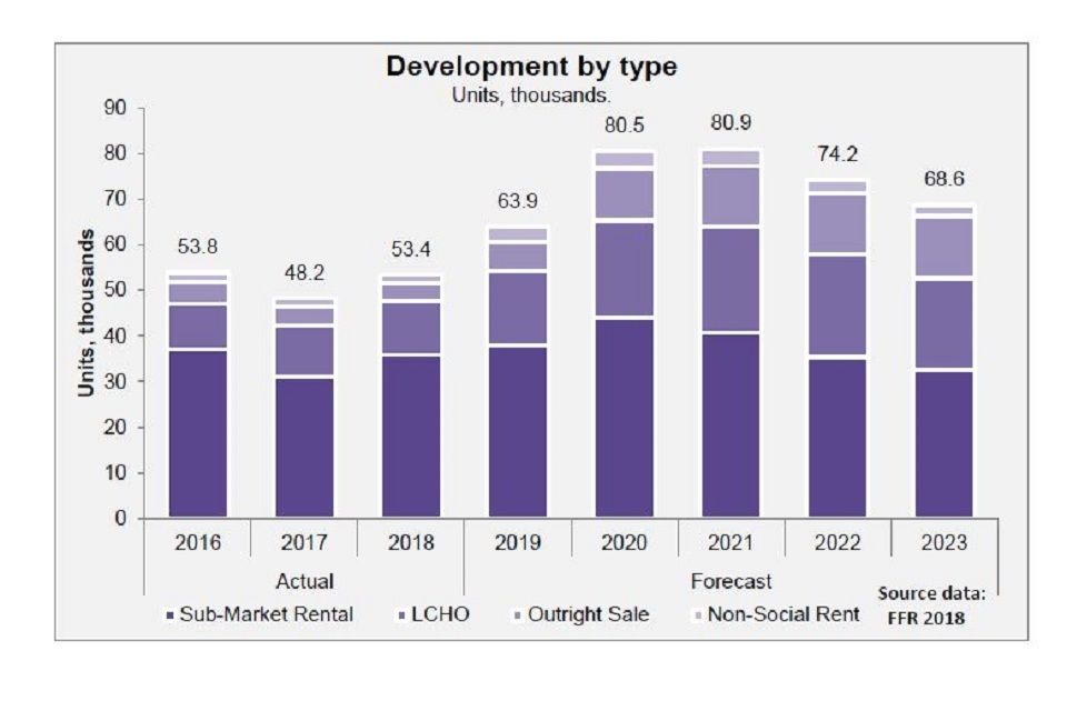73 - The sector has forecast that it will invest £74 billion on its development programme across all tenures over the next five years if it delivers the full level of supply in the current forecasts. Of that £74 billion, £53.5 billion will be invested in sub-market rent properties. The most significant intended source of funding to deliver this level of development is from sales receipts of £39 billion.