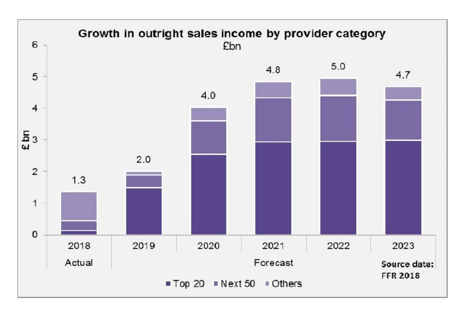 82 - Initial analysis of the latest forecasts show that revenue from properties developed for sale is forecast to increase from £2 billion in 2018/19 to £4 billion in 2019/20 and around £5 billion per year thereafter. This increase in activity is due to the number of current registered providers entering to this market. This is a significant shift in risk for some registered providers in that income generated from open market sales will account for almost half of their overall turnover. However, the contribution to surpluses is lower and very few registered provider forecasts needing sales receipts to cover either operating costs or interest payments. It is for those boards to recognise the extent of the specific risks associated with market sale activity including the market cycle and ensure that they can effectively mitigate the risks of a slowdown in sales volumes or reduction in market prices.