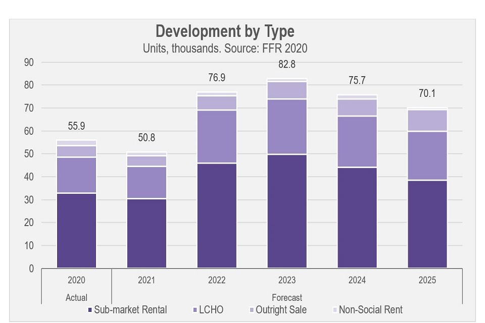 5.1 The development of new housing, both social and non-social, remains a key priority for government. Registered providers play an important role in meeting this demand, particularly the continued requirement for additional affordable housing for those whose needs are not met by the market, including the growing numbers on council waiting lists. Over the past decade providers have delivered significant levels of new supply. In 2019/20, private registered providers were responsible for the development of 56,000 new homes, of which 49,000 were for sub-market rent or low cost home ownership. Providers forecast the development of 356,000 new homes over the next five years.