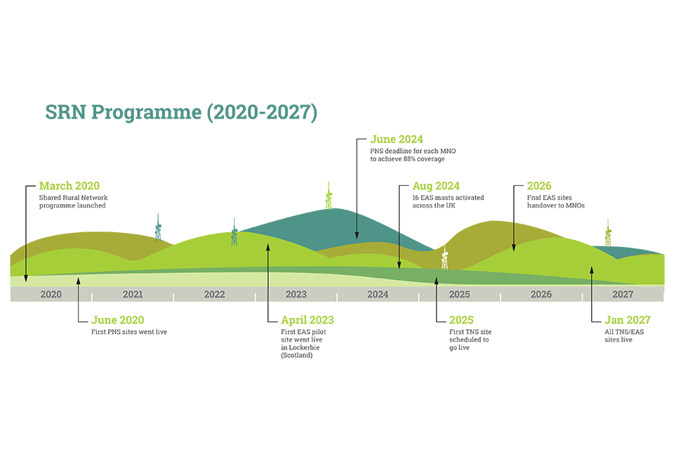 The Shared Rural Network (SRN) is designed to improve mobile coverage and boost connectivity across the UK. It is joint funded by the Government and the UK’s four mobile network operators (EE, Three, VMO2 and Vodafone), with the objective of delivering 4G coverage to 95% of the UK by December 2025. The programme will also improve coverage for an additional 280,000 premises and 16,000 kilometres of roads. It will lead to improvements in 4G coverage across all four nations, with the biggest uplifts in rural parts of Scotland and Wales.