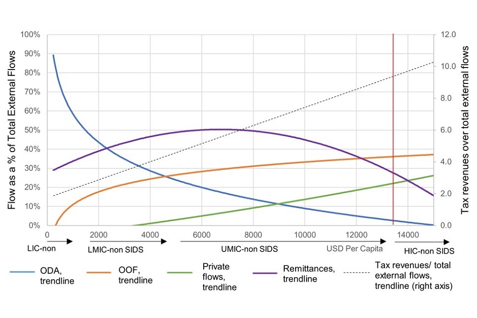 Figure 4: SIDS are much more reliant on ODA than other countries at the point of graduation ($13,845), while struggling to mobilise private finance or domestic tax revenues