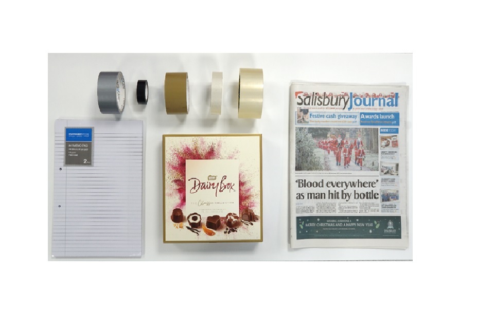 Figure 1: Image of the substrates used in the study. Five adhesive tapes (T1-T5): duct tape; electrical tape; thin brown packaging tape; office tape; clear adhesive tape. Three porous/semi-porous items (P1-P3): Paper – notebook style; Cardboard – laminated (confectionery box); Newspaper.