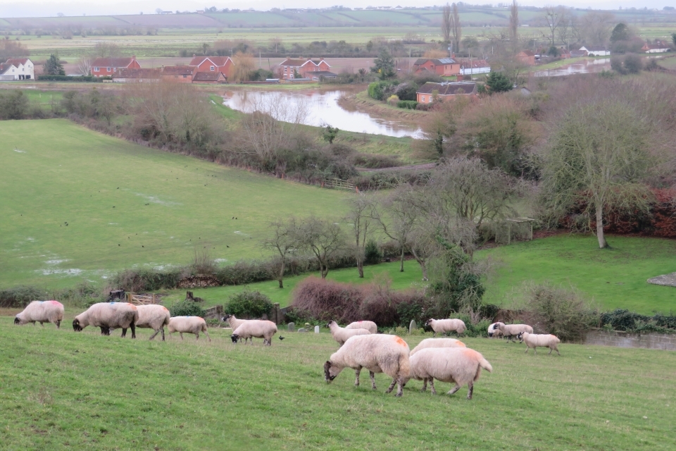 The photograph shows a sheep field taken from top of Burrow Mump in the River Parrett catchment.
