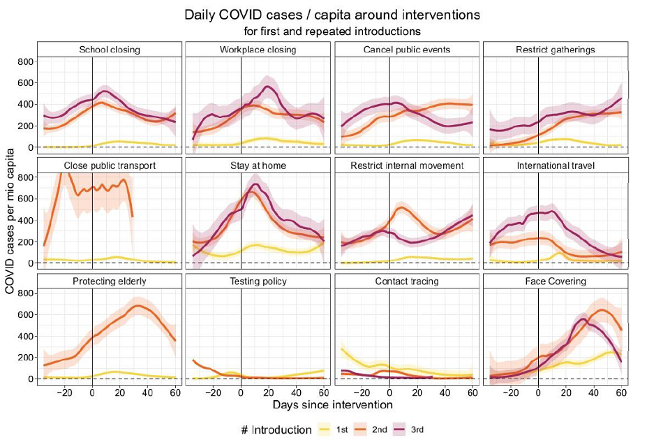 34. Figure 2 plots daily reported COVID-19 cases in the time period surrounding the introduction of behavioural interventions for the first, second and third time. The comparability of each repeated intervention is limited by differences in reporting of cases in the early phases of COVID-19. Countries engaged in different testing procedures and some only started to report cases later, suggesting that the data will have underreporting for the first introduction. Moreover, some interventions – such as the closure of public transport, protection of the elderly or stricter testing policies – were only introduced once (or twice for a small number of countries) or were continuously maintained at a high level. Another caveat is that behavioural interventions are part of a complex ecosystem of behavioural measures that interact and are hence difficult to measure in isolation. [low to medium confidence]