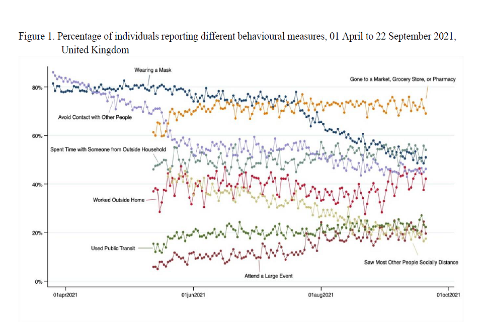 Figure 1. Percentage of individuals reporting different behavioural measures, 1 April to 22 September 2021, United Kingdom.