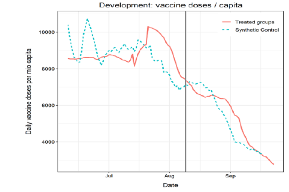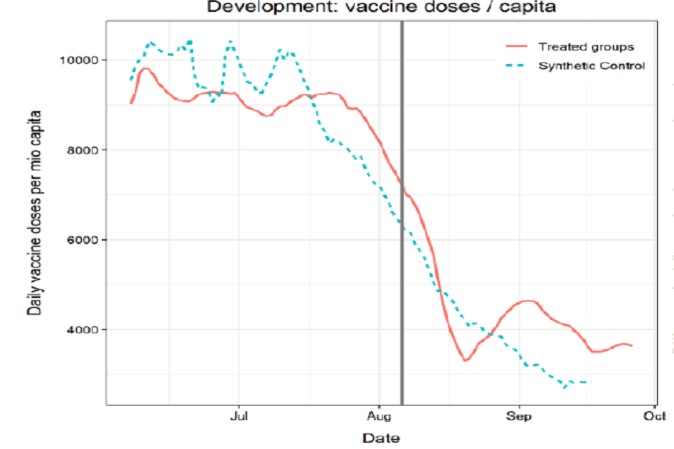 11. A primary analysis for this paper examined the impact of introducing COVID-19 certification on vaccine uptake. [footnote 6] Mirroring an RCT, the model compared 6 countries (Denmark, Israel, Italy, France, Germany, Switzerland) that introduced certification (May to August 2021), with 20 control countries. Estimates provide a counterfactual trend of what would have happened in virtually identical circumstances if certificates were not introduced on daily COVID-19 vaccine doses.