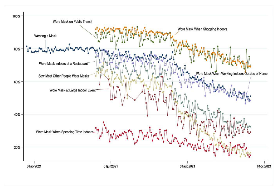 Graph showing percentage of individuals (y-axis) from April to October 2021 (x-axis) reporting mask wearing in 8 different settings (such as when using public transport or indoors at a restaurant), with each setting represented in a different colour.