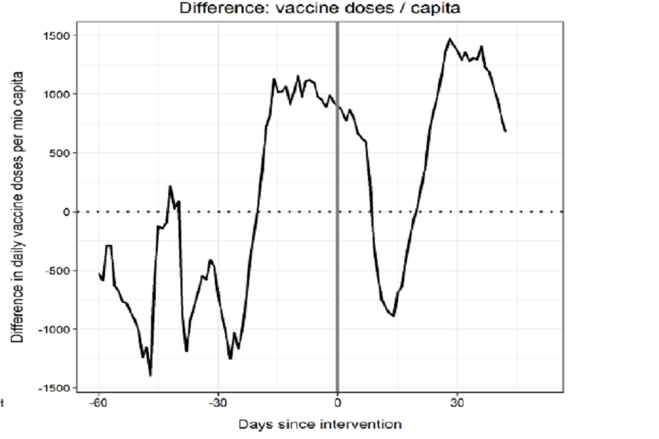 62. Quantifying this (right panel, Figure 4), the anticipation effect up to 20 days before certification was introduced in France meant that vaccine uptake exceeded the control country by 25,895 vaccines per million capita in total or stated in absolute terms, 1,749,589 doses. Vaccine uptake up to 40 days after certification was introduced exceeded the control country by 11,434 vaccines per million capita in total or 772,563 doses in absolute terms. Thus in total there was an increase of approximately 2.5 million doses or the relative measure of 37,329 per million attributed to this intervention.