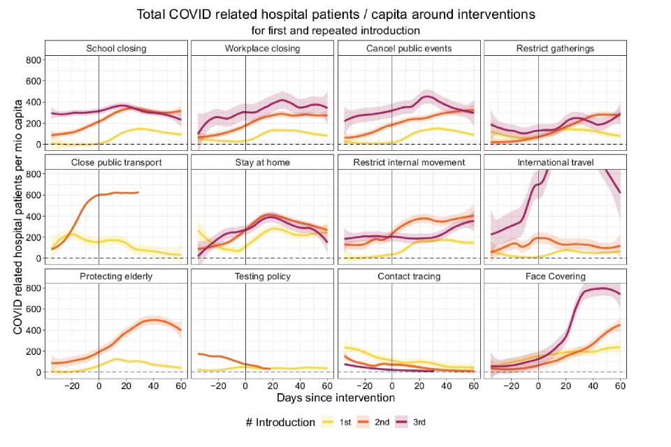 33. Given the recent reintroduction of behavioural interventions in some countries, there is limited evidence. For this reason, we engaged in a primary analysis to examine the relationship between the introduction of 12 behavioural interventions (for example, school closing, testing, face coverings), for a first, second or third reintroduction with reported COVID-19 cases, deaths and hospitalisations, the latter being a rough proxy for effectiveness of measures. A description of the data, measures and analytical methods are included in Appendix 1, comparing 30 countries in Europe, USA, Canada and Israel.