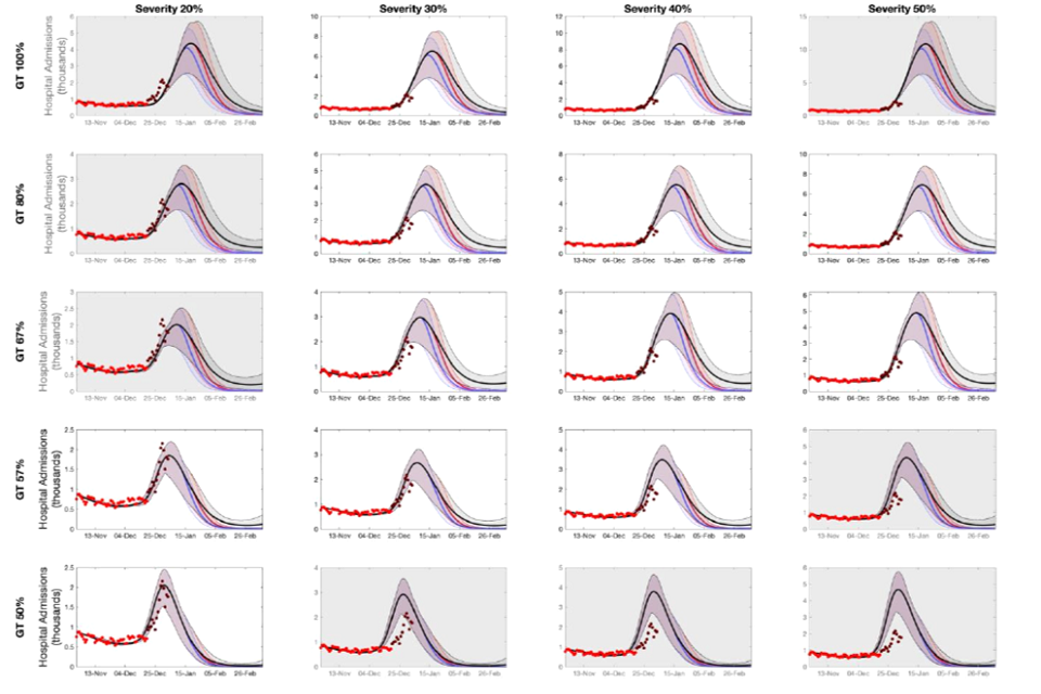 10. The University of Warwick have updated their previous modelling to account for recent data on both omicron’s intrinsic severity and vaccines’ effectiveness (see Annex 1). For different assumptions around omicron’s relative infection hospitalisation rate compared to delta (columns) and relative generation times (rows), the model is fitted on pre-Christmas data (red dots) and compared to post-Christmas hospitalisation data (dark red dots) [footnote 3]. Scenarios which fit the data poorly are unlikely to occur and are shaded in grey. Different policies are modelled with different coloured lines. These are discussed in the next section.