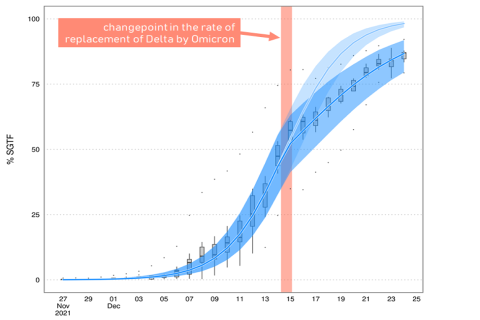 6. A second piece of analysis from UKHSA has shown that there was a clear reduction in the rate at which omicron replaced delta around 14 to 15 December, with omicron’s growth rate advantage approximately halving (Figure 1). There are several plausible explanations for this; one could be that omicron has a shorter generation time and that therefore Plan B measures or spontaneous behaviour change reduced omicron’s growth rate more than delta’s.