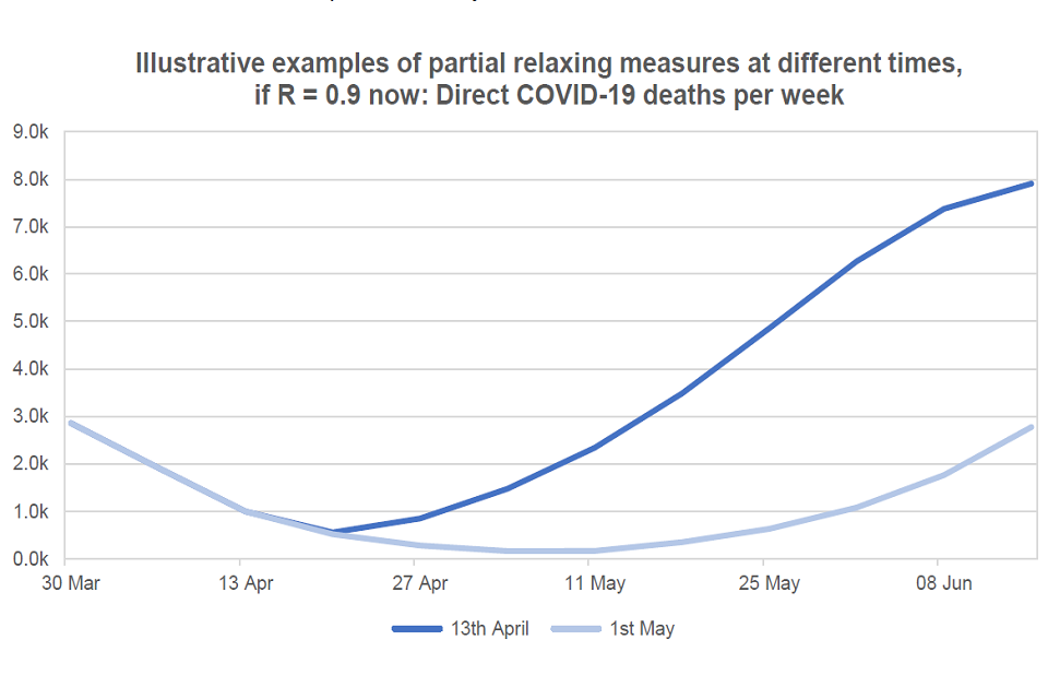 Line chart showing the illustrative impact of relaxing measures on weekly deaths. When measures are eased on 13 April, deaths exceed 30 March levels by mid-May and continue to rise. If eased on 1 May, the rise in deaths is lower and more gradual.