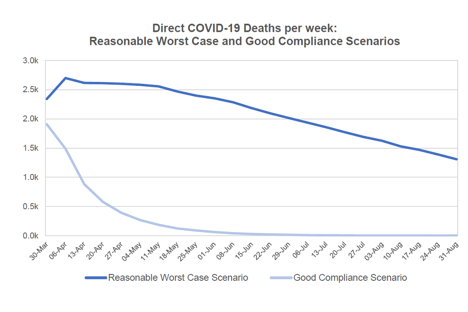 Line chart showing weekly deaths over 2,500 in April to mid-May in the reasonable worst-case scenario, falling to between 1,000-1,500 by the end of August. Under “good compliance”, weekly deaths fall from 2,000 in March to below 500 by the end of April.