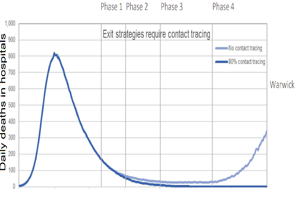 Text states “Exit strategies require contact tracing”. Line chart showing a resurgence in daily deaths in hospital in Phase 4 in the Warwick model if no contact tracing is assumed, but not if 80% contact tracing is assumed.