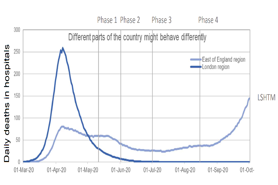 Text states “Different parts of the country might behave differently”. Line chart showing daily deaths in hospital peaking in April in London. In East of England, deaths are lower in April but then plateau above London levels before resurging in September