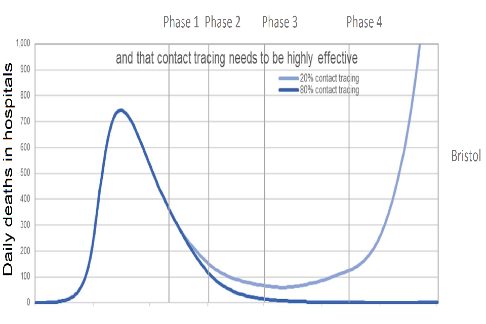 Text states “and that contact tracing needs to be highly effective”. Line chart showing a resurgence in daily deaths in hospital from Phase 3 onwards in the Bristol model if 20% contact tracing is assumed, but not if 80% contact tracing is assumed.