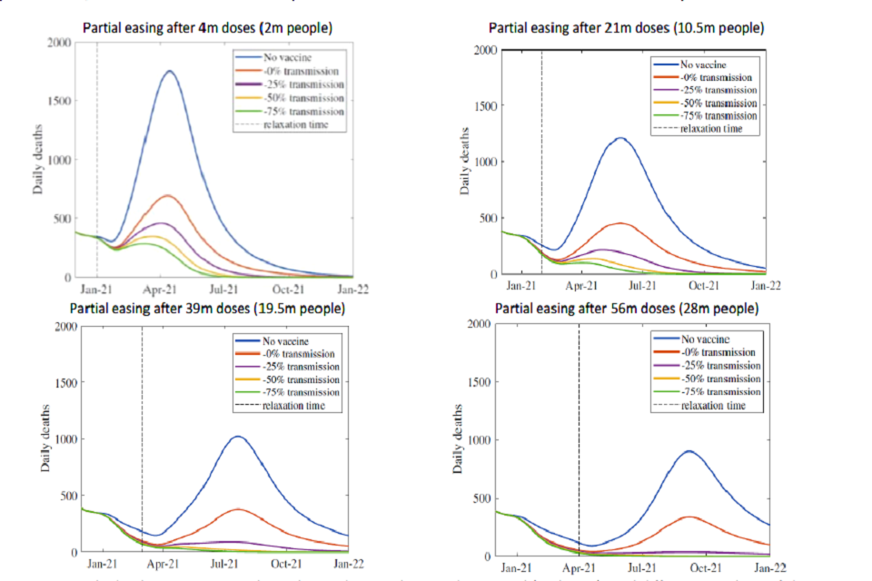 Figure 1: Daily deaths in scenarios where the epidemic is kept under control (with R <1) until different numbers of doses have been administered, at which point NPIs are relaxed (or there are equivalent changes in behaviours) that return R to early September levels (approximately 1.3) and maintained at this level indefinitely with varying degrees of reduction in transmission. From Warwick model, other assumptions in Appendix 1. All dates solely indicative and dependent on rollout speed.