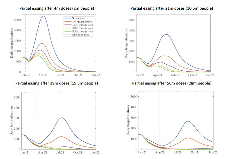 The fact that it may be very difficult to achieve herd immunity through a combination of vaccines and natural immunity from the 2020 waves of infection does not mean that vaccines cannot provide us with an exit strategy. If we can achieve very high vaccine coverage, particularly in the most vulnerable groups, we would be able to gradually reduce the number of restrictions in place in such a way that the subsequent resurgence in hospitalisations would be considerably smaller than the peaks seen in 2020 and therefore not threaten the NHS.