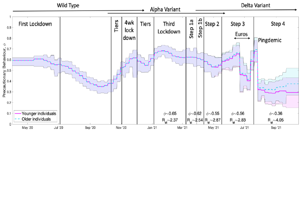 Figure 1: Inferred precautionary behaviour (phi) over time including the various periods of measures implemented and different predominant variants in circulation. Solid lines show the mean values and the shaded areas cover the 95% credible intervals (over 3 assumptions for the extent of waning vaccine effectiveness); mean phi and Rexcl_immunity values for the Delta variant are included below the plot. The pink solid line shows the inferred values for younger individuals aged under 40 while the dashed blue line shows the inferred values for the older population (over 60) with these 2 assumed to be equal before May 2021. Ages between 40 and 60 take values between the 2 inferred levels, increasing with age. phi values are assumed to vary slowly (with exceptions such as during the Euro 2020 football matches and ‘pingdemic’) and remain constant over a week.