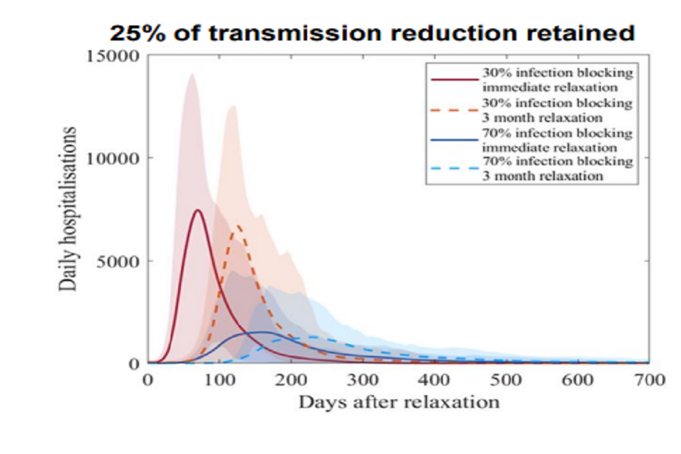 5. The right-hand panel in Figure 1 shows a return to pre-COVID-19 life (ie with no restrictions or lasting behavioural change at all) once JCVI groups 1 to 4 have received 2 doses of vaccine and groups 5-9 have received 1 dose. At the equivalent time point in the left-hand panel, 25% of restrictions remain – ie 25% of transmission reduction is retained compared to 0% in the right-hand panel.
