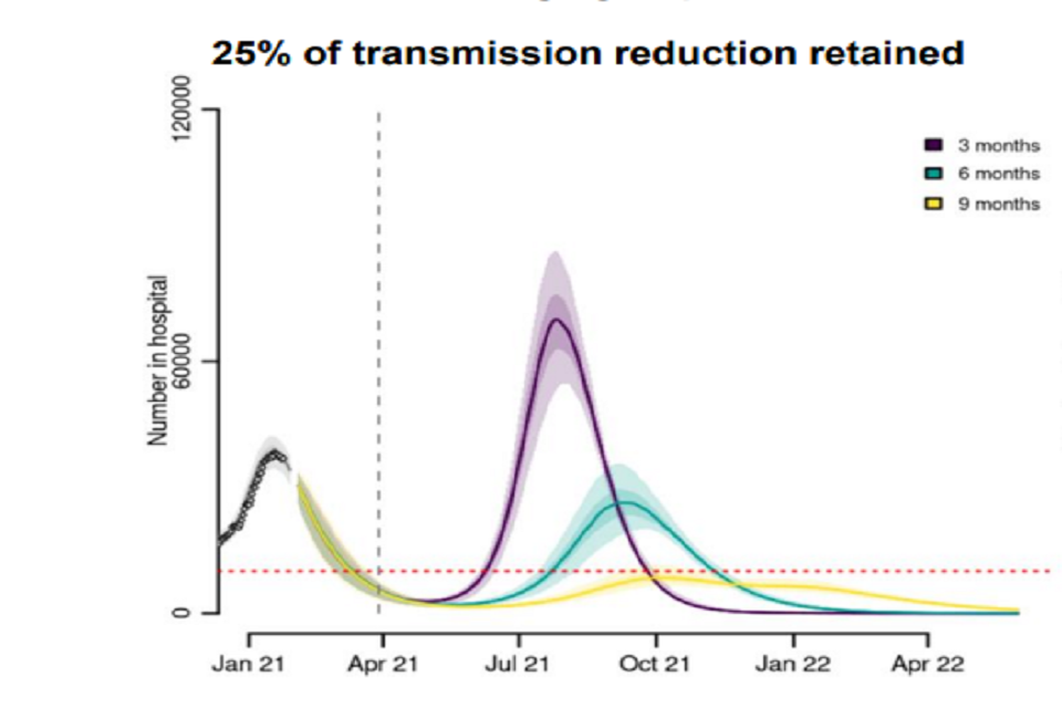 8. In both scenarios, a relaxation over 3 months results in a resurgence in hospital occupancy that is larger than seen in January 2021. This is due to the large number of people in vulnerable groups who still do not have direct protection (either because they have not been vaccinated, or because their vaccination has not stopped them becoming ill) nor indirect protection from wider population immunity (because many people in younger age groups have not yet been vaccinated). The UK has a large number of older people so very many deaths could still occur unless their vaccine coverage is extremely high.