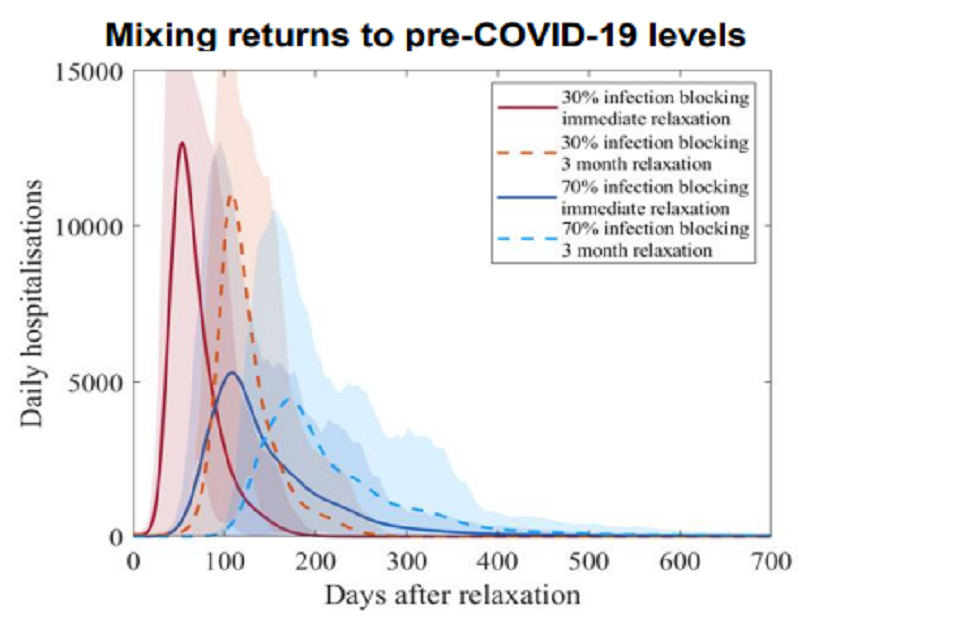 6. Even if vaccines reduce the risk of infection by 70% (blue lines), the subsequent wave is much smaller when some transmission reduction remains (Figure 1 – left panel) compared to a return to January 2020 mixing (Figure 1 – right panel). Gradually relaxing measures over 3 months (dashed lines) leads to lower peaks than doing so overnight (solid lines), partly because more people have been vaccinated over this time. For context, the 7-day rolling average of UK COVID-19 hospital admissions peaked in January 2021 at 4,200.