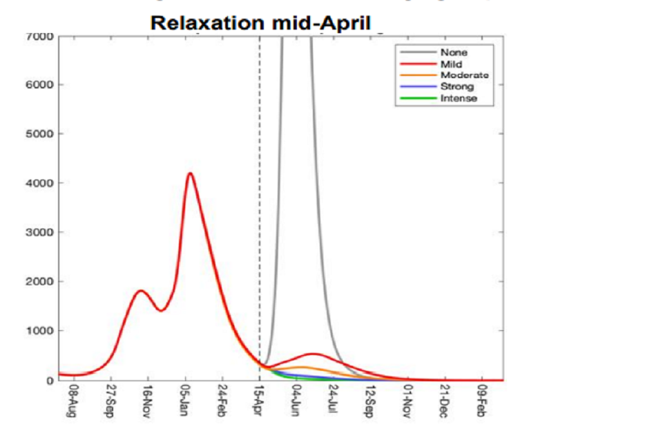 Figure 3: Daily COVID-19 hospital admissions in the UK if measures are retained at their current levels until mid-March (left) or mid-April (right) after which mixing patterns revert to those that, in February 2021, would equate to R=1.2 (red), 1.1 (orange), 0.9 (blue), or 0.8 (green). This level of restriction is then maintained indefinitely. For context, returning to pre-COVID-19 mixing is given in grey. Assumes vaccines reduce hospital admission by 70% and 88% 3 weeks after dose 1 and dose 2 respectively; vaccines reduce risk of infection by 48% and 60% after dose 1 and dose 2 respectively; rollout of 2.5m per week from March and coverage reaches 85% in all age groups.
