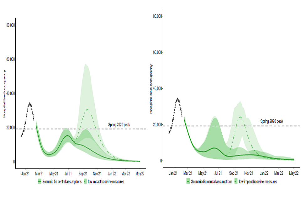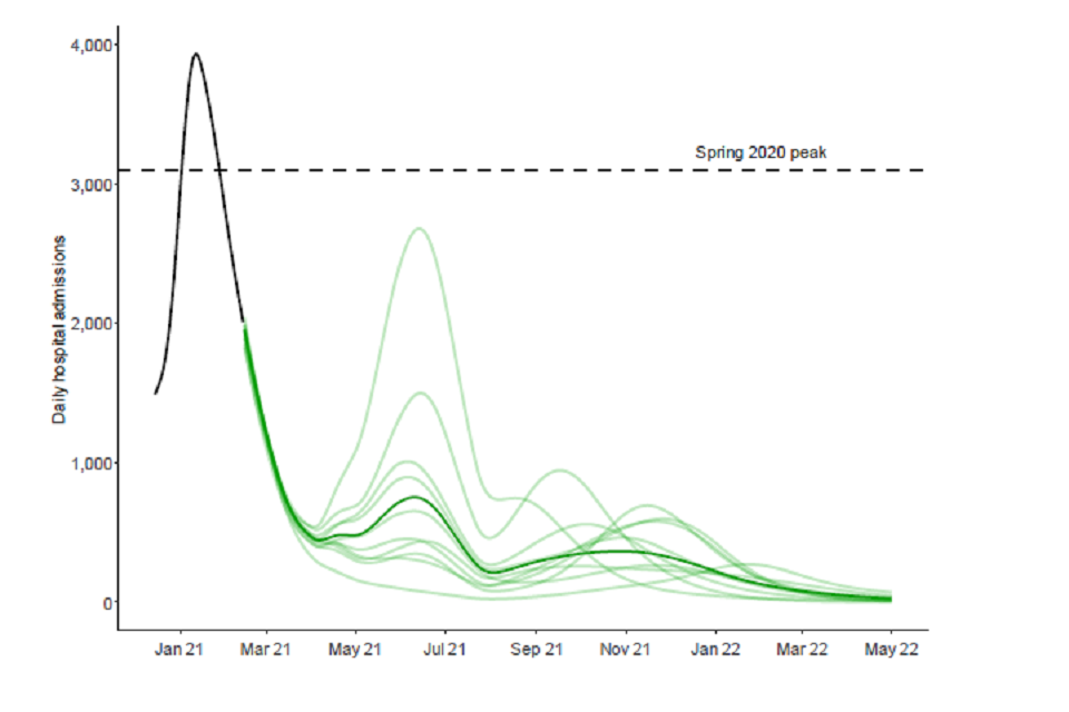 20. The combination of a gradual approach to the easing of restrictions could, however, if vaccines are highly effective and rapidly rolled out and longer-term baseline measures achieve a significant reduction in transmission, keep further resurgences well below the level of those seen in January 2021.