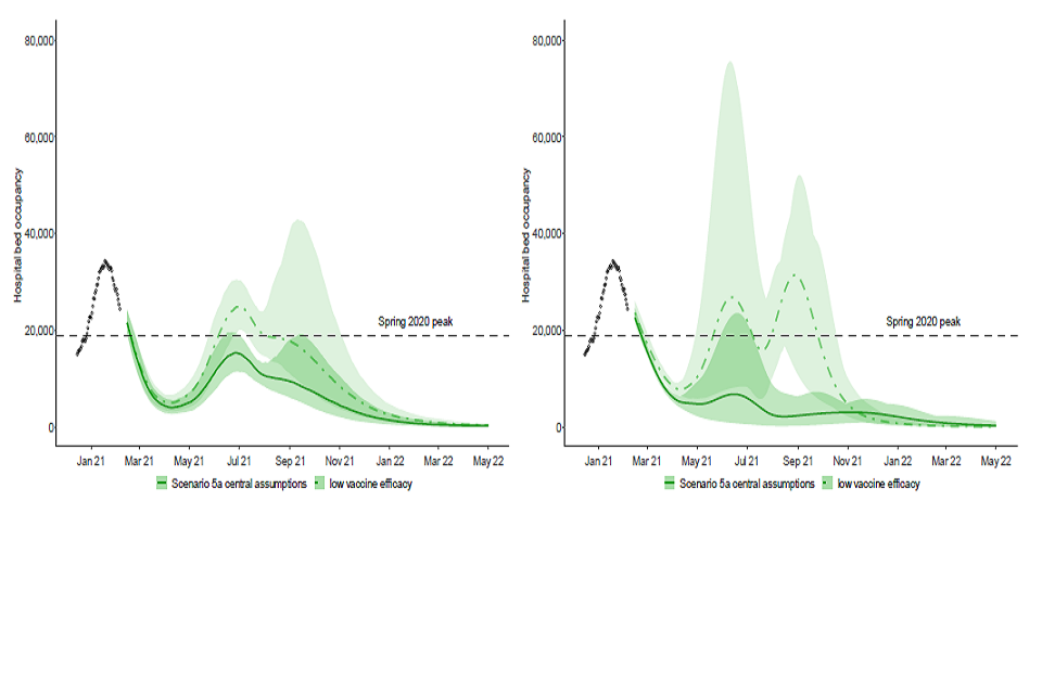 29. As with SPI-M-O’s previous work the results of the new scenarios are critically dependent on their vaccine effectiveness assumptions. If the real-world performance of the vaccines is not as good as the assumptions used here, the subsequent resurgence would be larger.