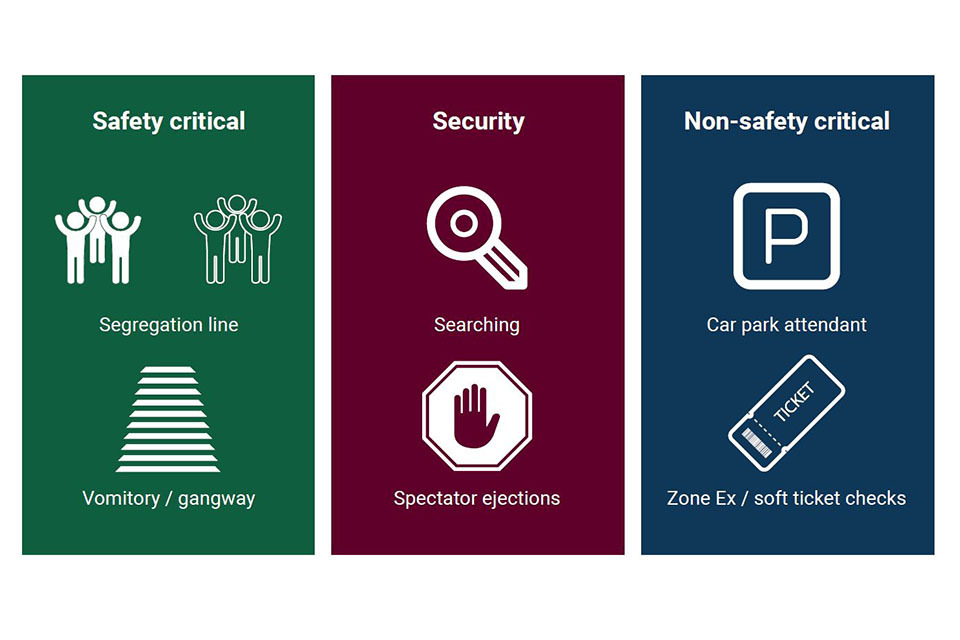 Roles within a sports ground can be identified as safety, security and non-safety critical (often referred to as the service element to stewarding). Ground management should identify these roles and locations to best utilise the resources available to them. This may vary from event to event.