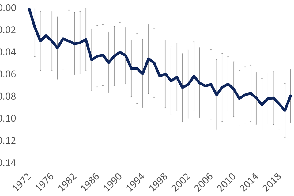 Estimates of the log uniform difference (UNIDIFF) parameter across birth cohorts from 1972 to 2020.