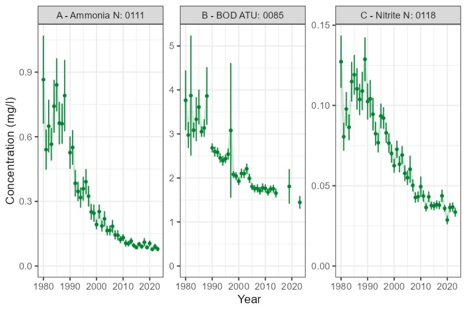 For orthophosphate, nitrite, ammonia and BOD, concentrations have substantially reduced over the period 1990 to 2023: arithmetic mean ammonia concentrations have reduced by 85%, BOD by 46% and orthophosphate by 83%. Concentrations have continued to decrease in the period from 2000 and from 2010, although in recent years there are relatively little available data for BOD.