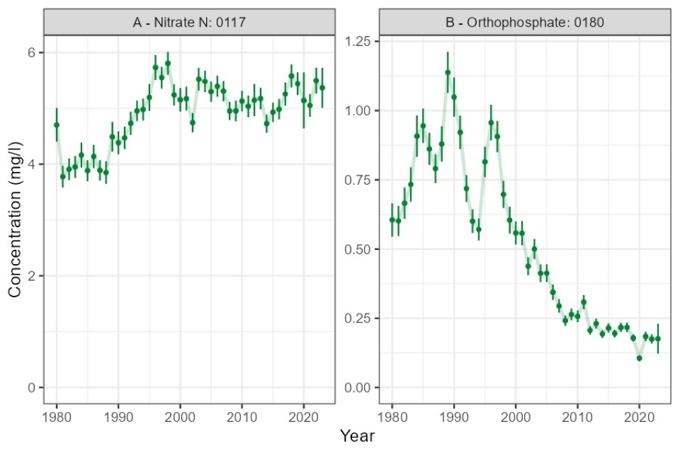 Figure 3. England HMS sites: trends from 1980 to 2023 in arithmetic mean concentration (with 95% confidence interval) of A: nitrate as N, B: orthophosphate.