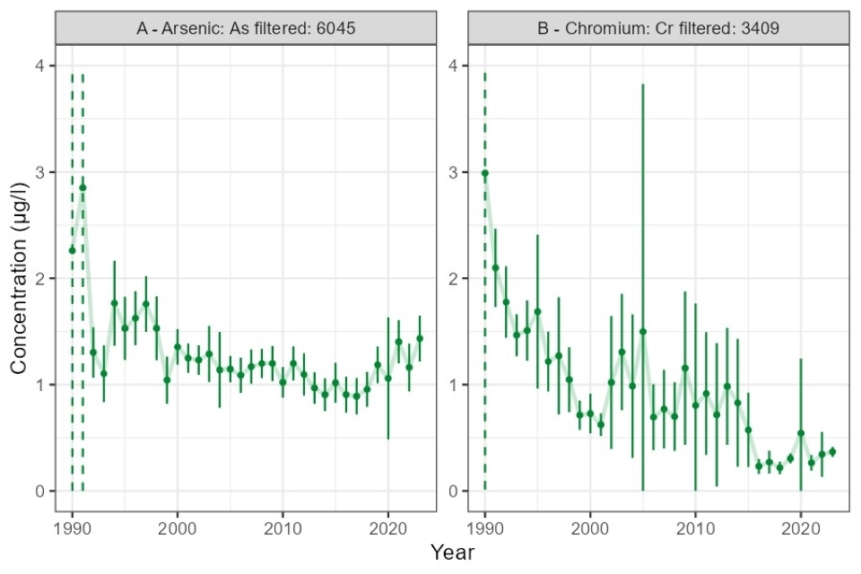 Figure 4. England HMS sites: trends in arithmetic mean concentration (dissolved, filtered, with 95% confidence interval) from 1990 to 2023 of A: arsenic, B: chromium. Dashed lines indicate truncated upper confidence interval (see Appendix A).